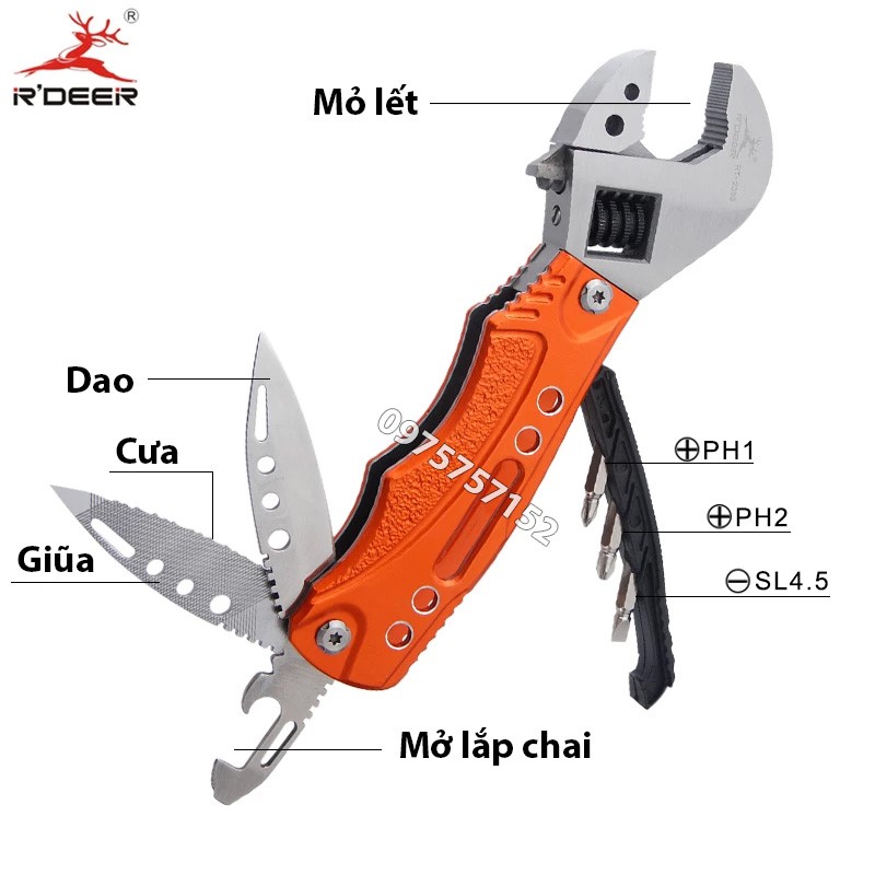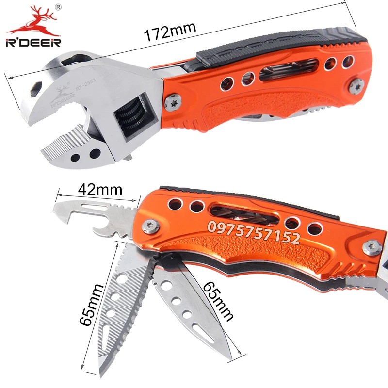 Mỏ lết đa năng cao cấp 8 trong 1 R’DEER RT-2353, nhỏ gọn, tô vít, dao, cưa, giũa, mở lắp chai, thiết kế thông minh