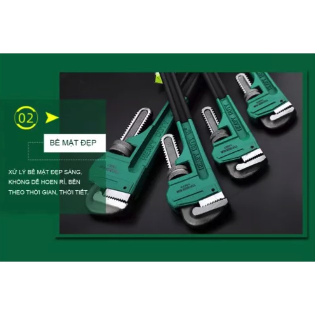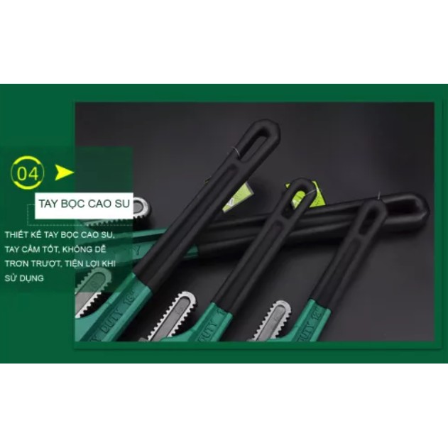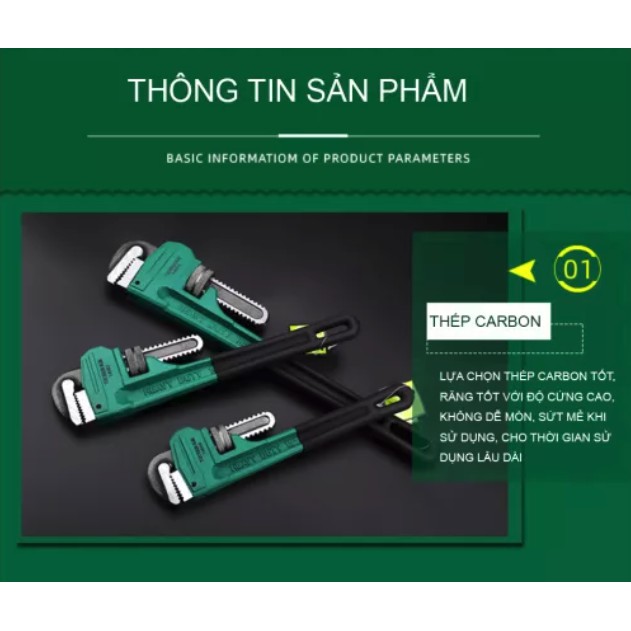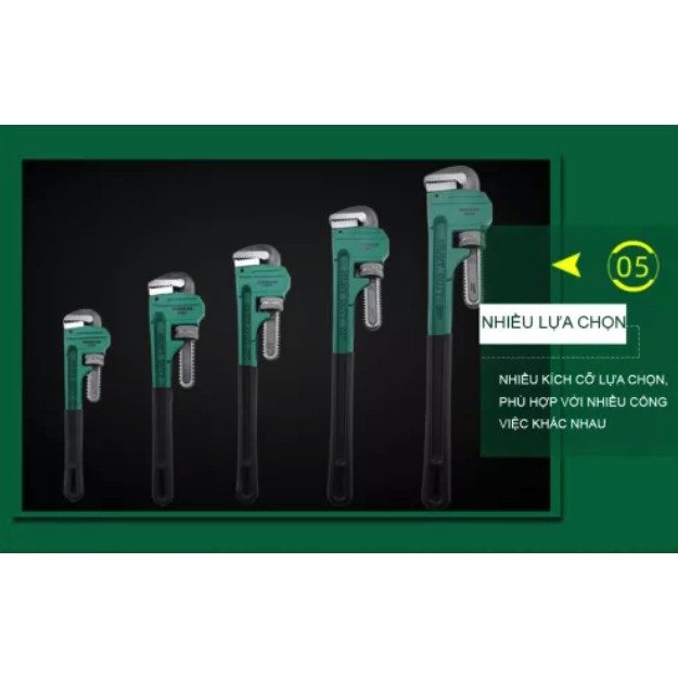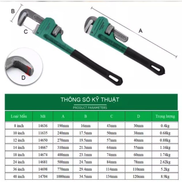 Chất liệu: Thép 45# với độ cứng cao, mô men xoắn lớn.Các cỡ lựa chọn phù hợp nhiều công việc: 8inch, 10inch, 12inch, 14inch, 18inch, 24inch, 36inch, 48inch