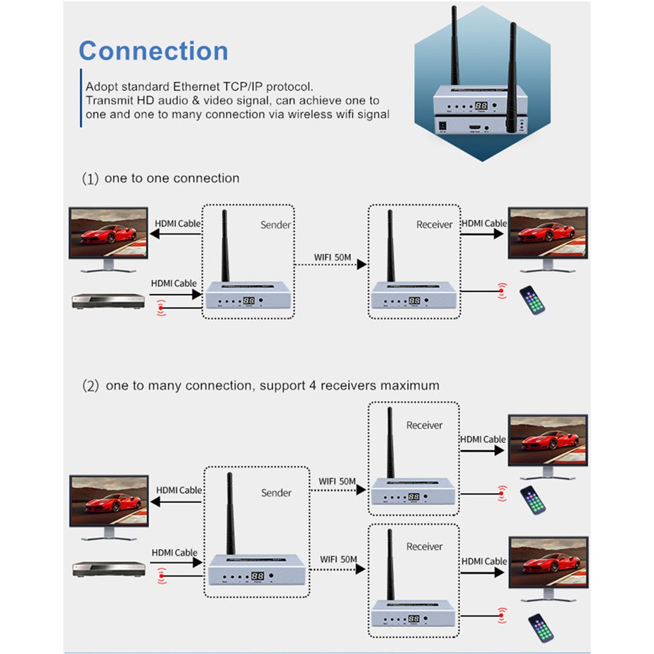 HDMI extender với một tiêu chuẩn Ethernet TCP/IP giao thức, thông qua không dây WIFI truyền tín hiệu HD âm thanh và tín hiệu video, mà có thể nhận ra các one-to-nhiều ứng dụng, tại cùng một thời gian, với hồng ngoại phần mở rộng để làm cho điều khiển từ xa thuận tiện hơn. các thiết bị có tuyệt vời xử lý hình ảnh và khả năng truyền tải, làm cho truyền tín hiệu mịn hơn và ổn định, Là một loại của kinh tế và cách hiệu quả của tín hiệu HDMI mở rộng.Bộ mở rộng HDMI không dây 50m DTECH DT 7060 với IR Enternet Wifi