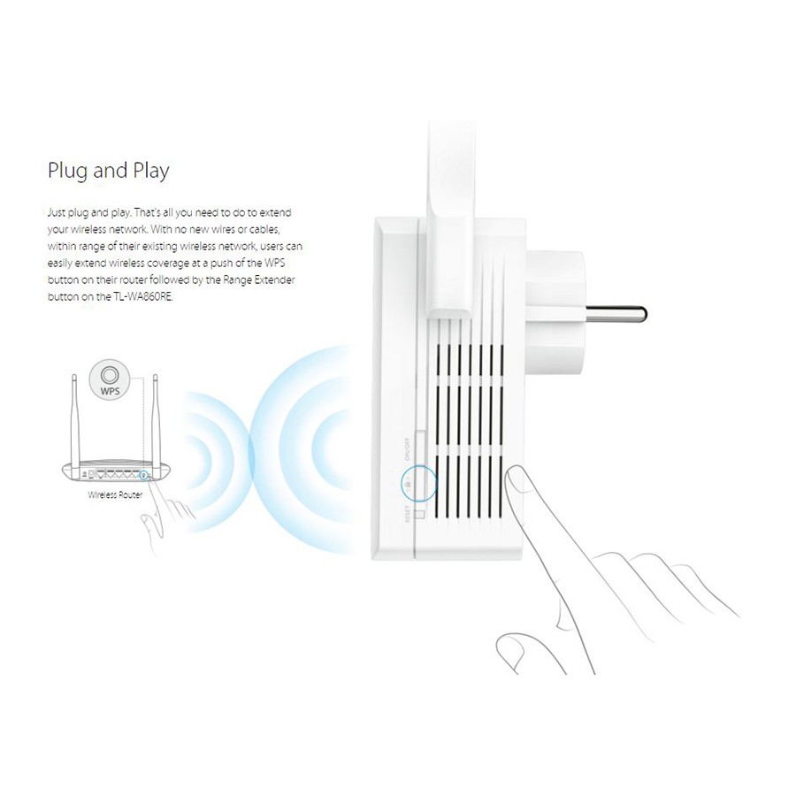 Không cần những sợi dây vướng víu, bạn có thể dễ dàng mở rộng phạm vi phủ sóng chỉ bằng các nhấn nút WPS trên Router của mình, sau đó nhấn nút mở rộng sóng trên TL-WA860RE hoặc ngược lại. Thêm một lần nhấn nút ghép cặp có thể nhanh chóng thiết lập một kết nối bảo mật với thiết bị khách.