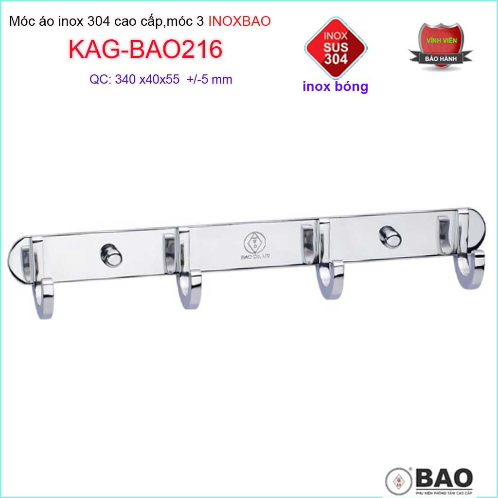 Móc treo đồ cao cấp Inox Bảo, móc áo phòng tắm Inox SUS304 KAG-BAO216 làm bằng inox 304 chất lượng cao cấp với công nghệ hiện đại, thiết kế sắc nét từng góc cạnh, kỹ lưỡng đến từng chi tiết tạo nên 1 sản phẩm hoàn hảo thích hợp cho mọi phong cách phòng tắm.