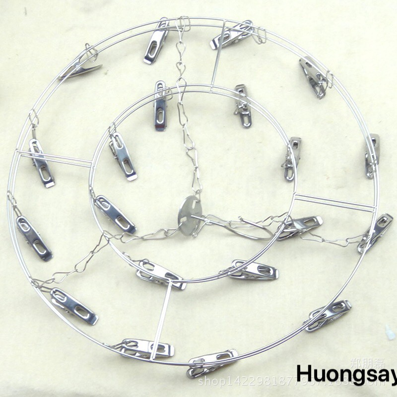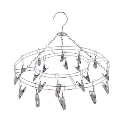 Móc chùm inox hình tròn giúp tiết kiệm không gian khi phơi đồ, đặc biệt với những món đồ nhỏ như tất, khẩu trang, đồ sơ sinh...Chất liệu inox giúp bền theo thời gian, không lo bị gẫy, vụn như móc nhựa, phơi được ngoài nắng nóng. Móc treo đường kính 35cm, có 20 chiếc kẹp.