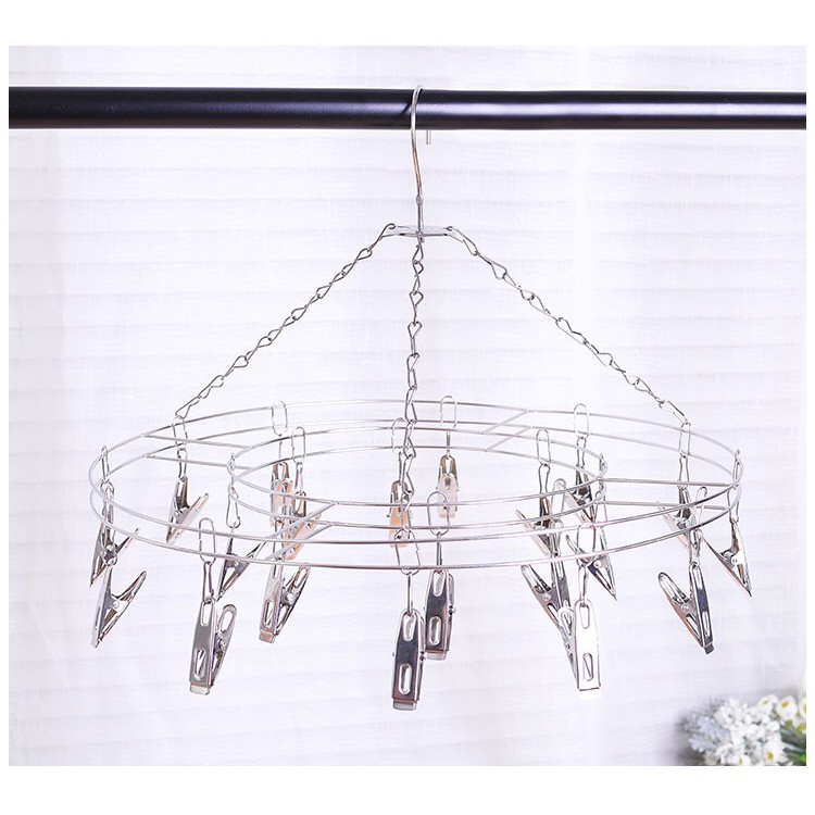 Móc chùm inox hình tròn giúp tiết kiệm không gian khi phơi đồ, đặc biệt với những món đồ nhỏ như tất, khẩu trang, đồ sơ sinh...Chất liệu inox giúp bền theo thời gian, không lo bị gẫy, vụn như móc nhựa, phơi được ngoài nắng nóng. Móc treo đường kính 35cm, có 20 chiếc kẹp.