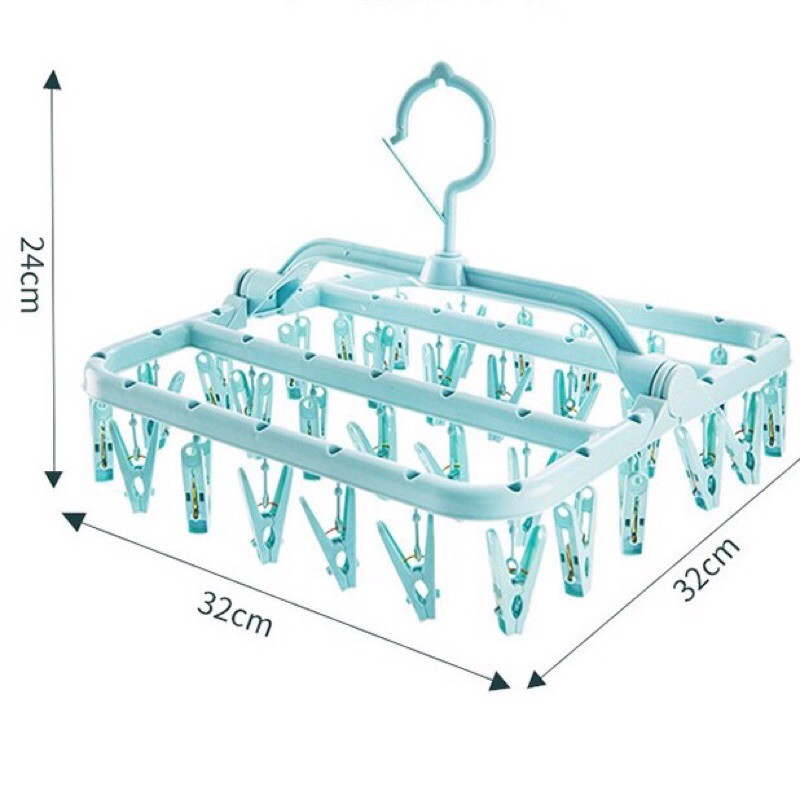 - Móc gồm 32 chiếc kẹp nhỏ giúp bạn phơi khăn tay, tất, găng tay, khăn len của bé mà không lo bị rơi dù trời gió to.