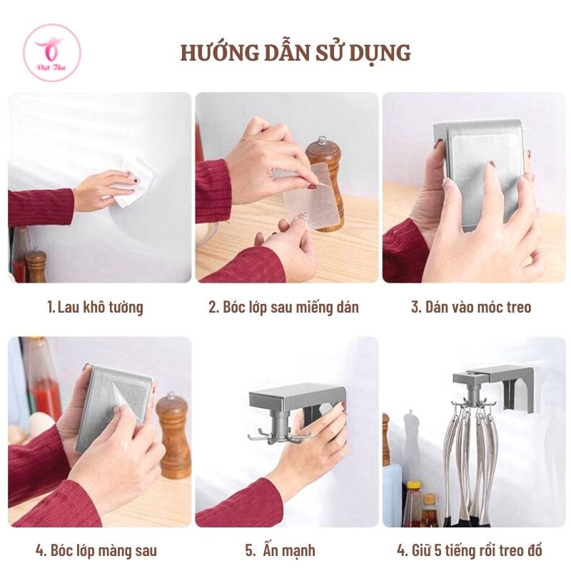 - Móc dán tường treo đồ 6 trong 1 là trợ thủ đắc lực cho không gian nhà bếp thêm nhiều phần tiện lợi.