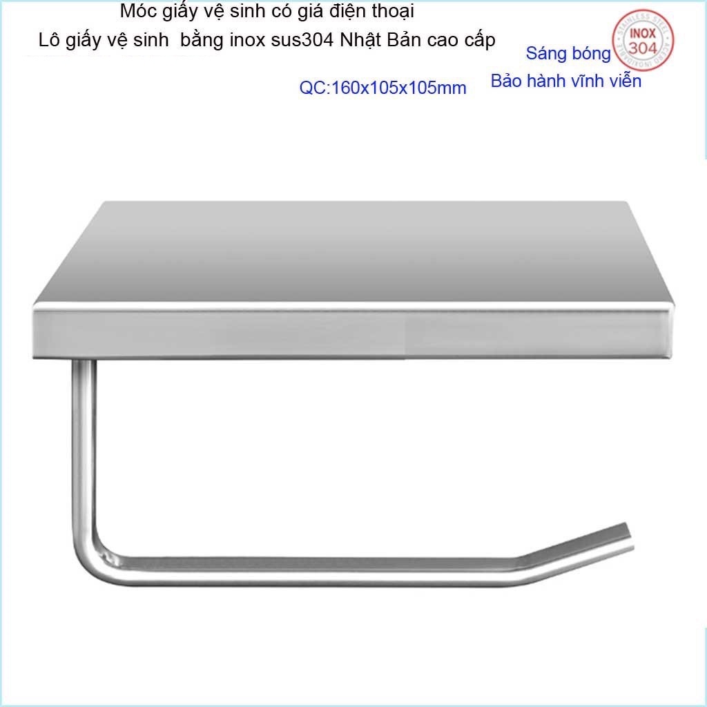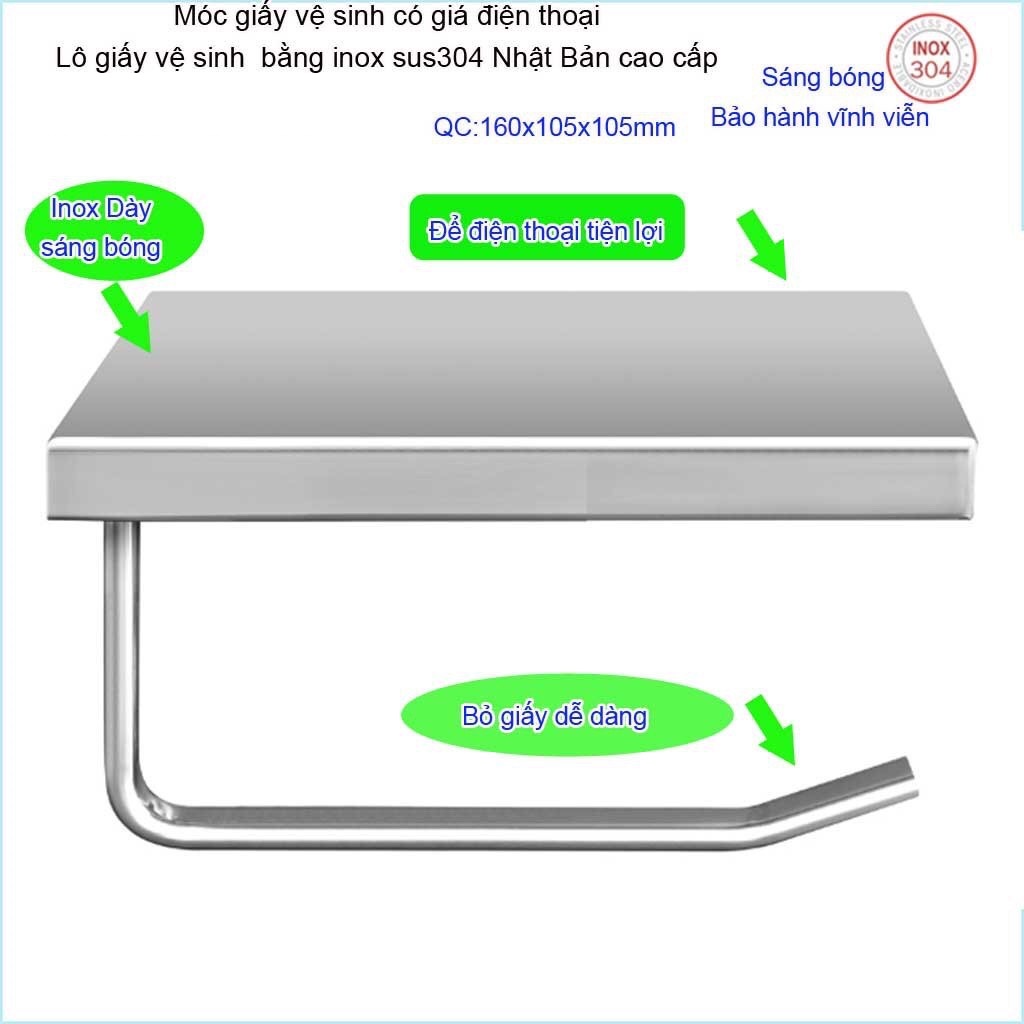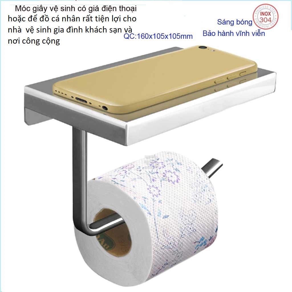 Móc giấy vệ sinh có giá đỡ điện thoại, Hộp đựng giấy vệ sinh inox 304, kệ để giấy 304 Nhật Bản
