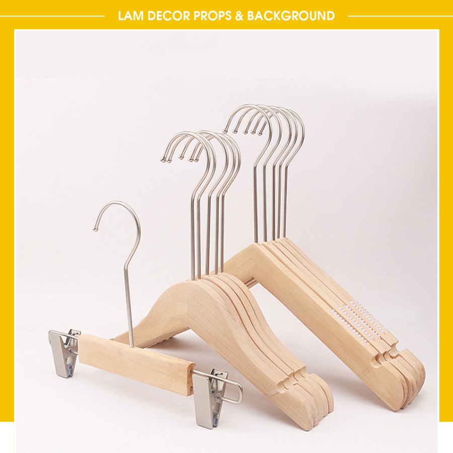 Móc gỗ chụp hình hoặc móc treo quần áo bằng gỗ giúp khách hàng chụp quần áo đẹp hơnCó 2 loại khác nhau để bạn lựa chọn, đó là móc chữ V và móc có kẹp để kẹp quần và váy.