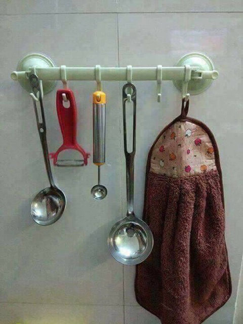 ❹ Móc treo đồ có thanh ngang bằng inox không gỉ, trên thanh có đến 8 móc treo có trượt để thay đổi vị trí giúp bạn treo các loại khăn, quần áo trong nhà tắm hay các vật dụng nhà bếp như muôi, dao, kéo, thớt một cách gọn gàng & dễ dàng nhìn thấy ngay khi cần sử dụng.