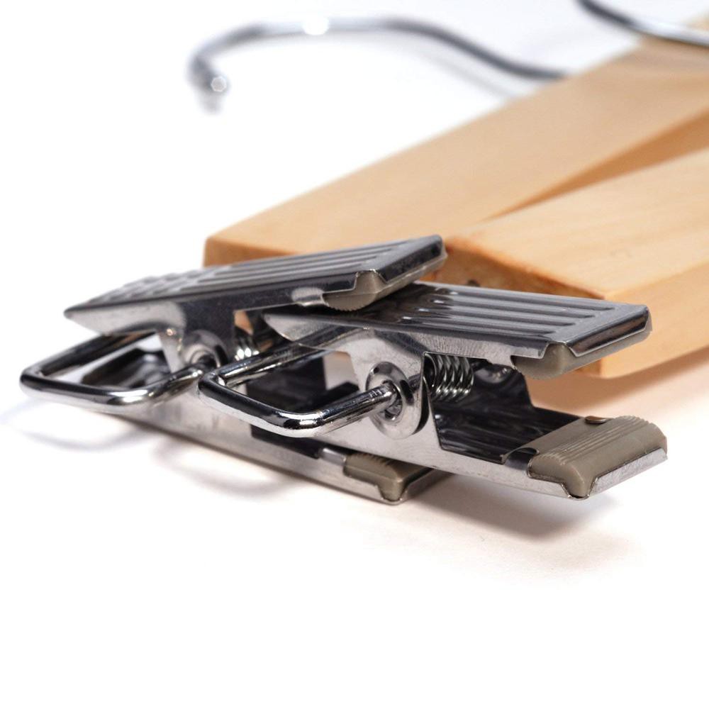 Móc làm từ gỗ thật, sơn phủ bóng, màu vàng tự nhiên cao cấp. Đầu móc và đâu kẹp được làm từ kim loại cứng chắc đảm bảo khi treo móc quần áo nặng. Đặc biêt đầu kẹp có đệm cao su giúp bảo vệ quần áo của bạn khi sử dụng
