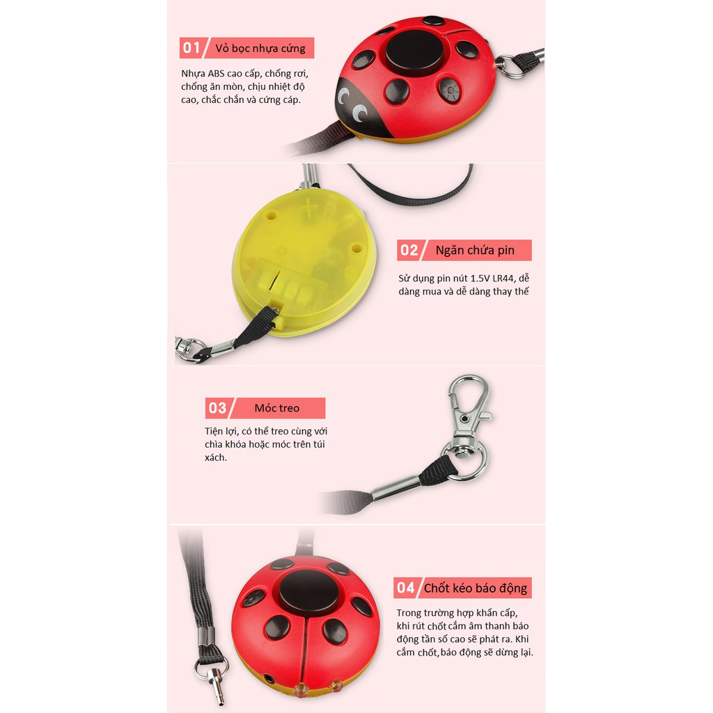 Móc khóa - Thiết bị báo động chống trộm hình bọ cánh cứng được thiết kế thông minh với khóa chốt rất an toàn dễ dàng sử dụng. Âm thanh báo động lớn, gây chú ý cho mọi người xung quanh khi có trộm. Có thể dùng để cài móc khóa bảo vệ điện thoại, bóp, ví, cài vào balo, túi xách khi đi tàu, xe để chống kẻ gian móc túi…THÔNG SỐ KỸ THUẬT: