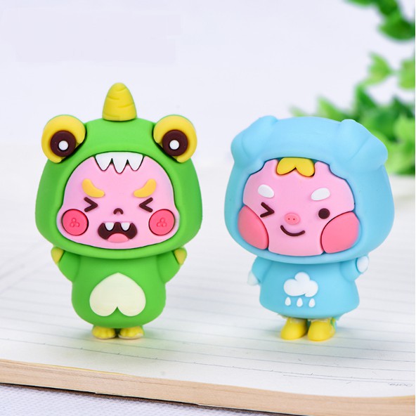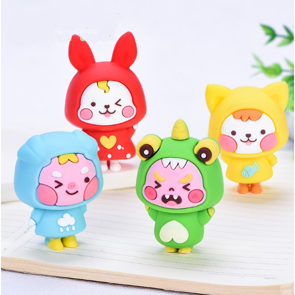Chất liệu: nhựa mềm. Tạo hình sản phẩm là mô hình em bé mặc đồ Cosplay hình Khủng long, Cáo, Heo và Thỏ dễ thương, rất thích hợp làm móc khóa, đồ trang trí bánh, DIYKích thước : cao 5.5 x 4.0cm