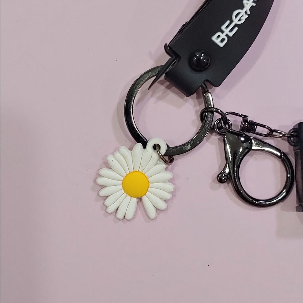 Móc khóa được thiết kế dạng máy ảnh vintage với họa tiết là hoa cúc họa mi trắng, vỏ móc khóa được phủ da làm tăng vẻ sang trọng.