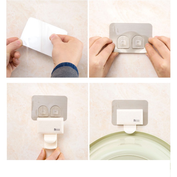 - Dán miếng dán giữ kệ, lấy tay miết mạnh để miếng dán dính chặt vào tường, lắp giá lên (không tháo miếng dán ra để dán lại, vì sẽ không còn chắc nữa)