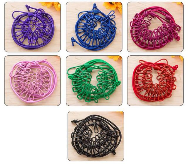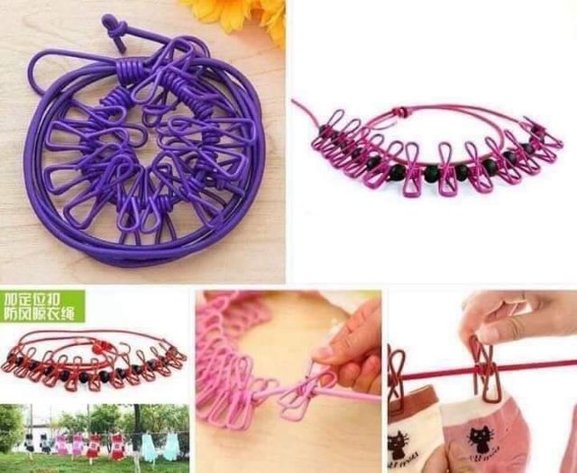 Dây phơi quần áo,,,có móc kèm dây phơi, giúp quần áo không bị tuột hay rơi khi phơi, quần áo sẽ không bị trùng vào nhau. Chất liệu: inox và dây dù. Kích thước: dài 180cm