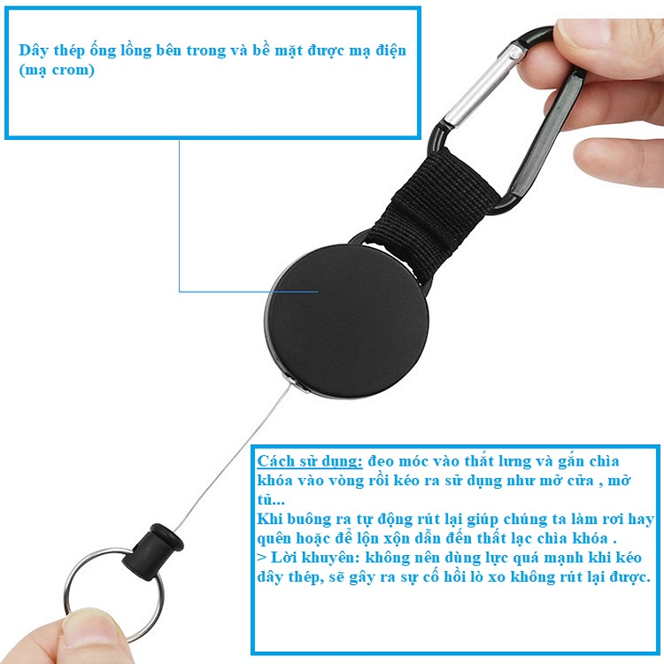 Cách sử dụng: Đeo chìa khóa vào thắt lưng, đeo chìa khóa vào khoen chìa rồi duỗi ra để mở cửa khi sử dụng. Hãy để nó ra khi không sử dụng, nó sẽ tự động đàn hồi trở lại thắt lưng, tránh tình trạng mất chìa khóa thường xuyên do ném ngẫu nhiên.