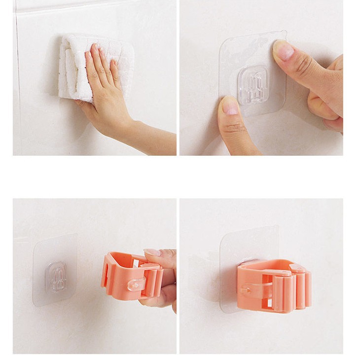 - Tiện ích: . Móc kẹp treo cây lau nhà giúp bạn giữ cây lau nhà luôn khô ráo, không làm hư hại mặt gạch. . Không cần phải khoan tường gắn đinh, dán móc bằng keo 2 mặt, khả năng chịu lực tốt đến 6 kg. . Ngoài ra, bạn có thể dùng treo các vật dụng khác (chổi, cây lau kính,…) . Mặt keo dính tốt trên mặt nhẵn như gạch men, đá cẩm thạch, thủy tinh…