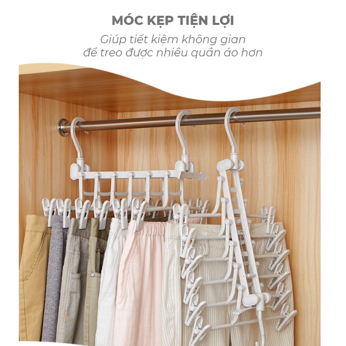 1 móc có thể treo đến 6 chiếc quần áo , giúp bạn tối ưu diện tích của chiếc tủ quần áo gia đình nhà mình