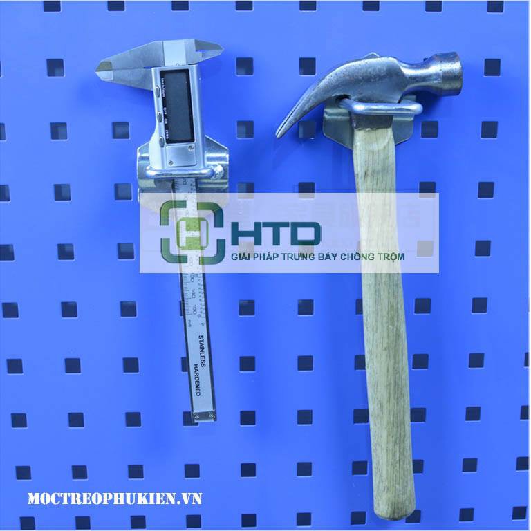 - Móc treo búa, móc treo kìm chuyên dụng H10 được cài lên các tấm bảng panel lỗ vuông , các tấm panel này được dập khuôn với các kích thước có sẵn hoặc tùy chỉnh, các tấm bảng lỗ này được thiết kế với độ dày 1,2mm và phủ lớp sơn tĩnh điện bên ngoài.
