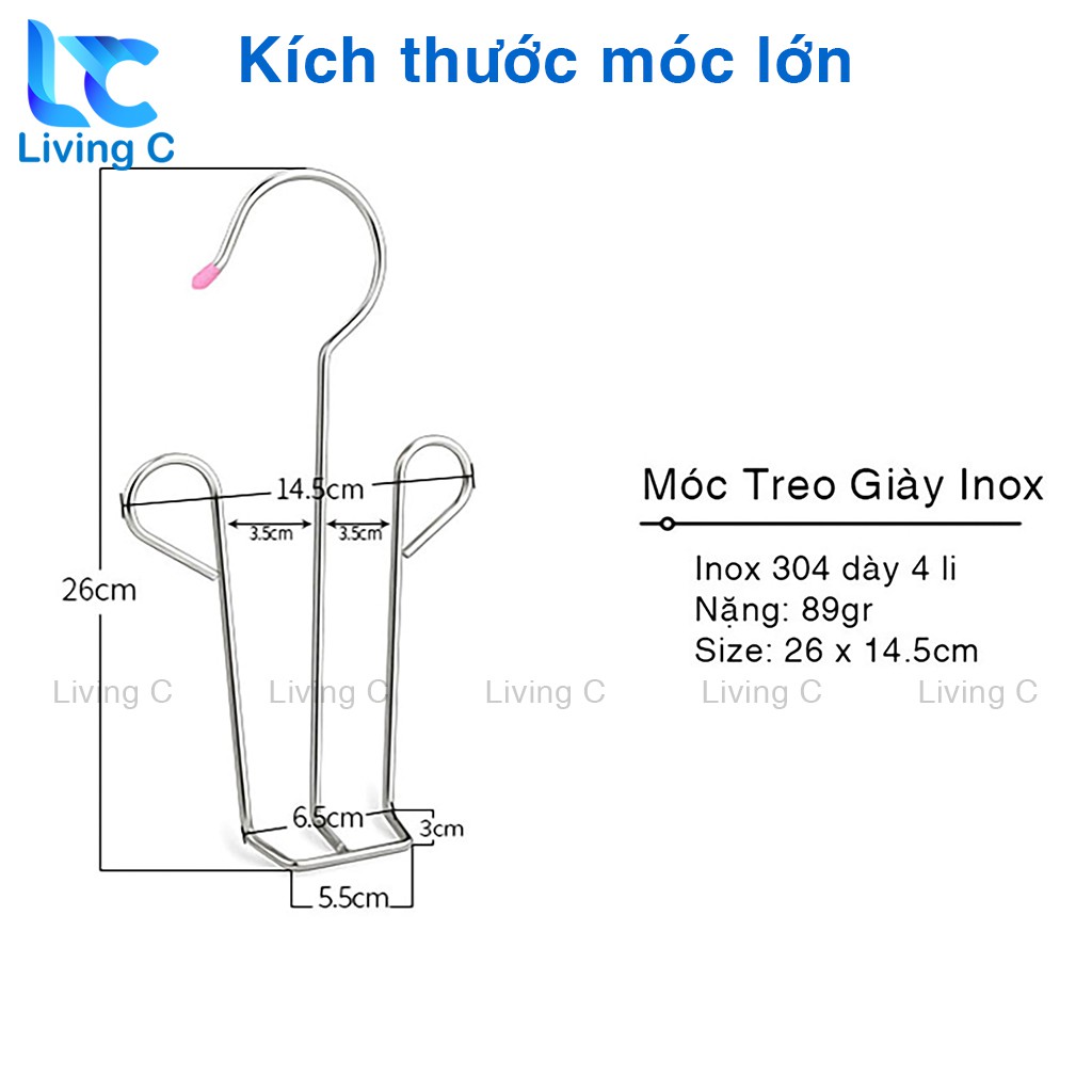 - Tên sản phẩm: Móc treo phơi giày dép bằng Inox Living C MG, Móc treo giữ phom giày dép bằng inox 304 dày 4 ly