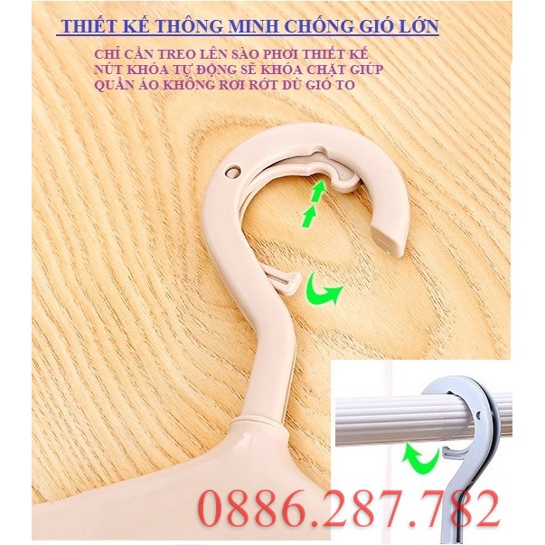 - Thiết kế thông minh chống gió lớn khi treo lên sào móc sẽ tự động bật chốt khóa ôm sát vào sào phơi, không bị gió thổi bay.