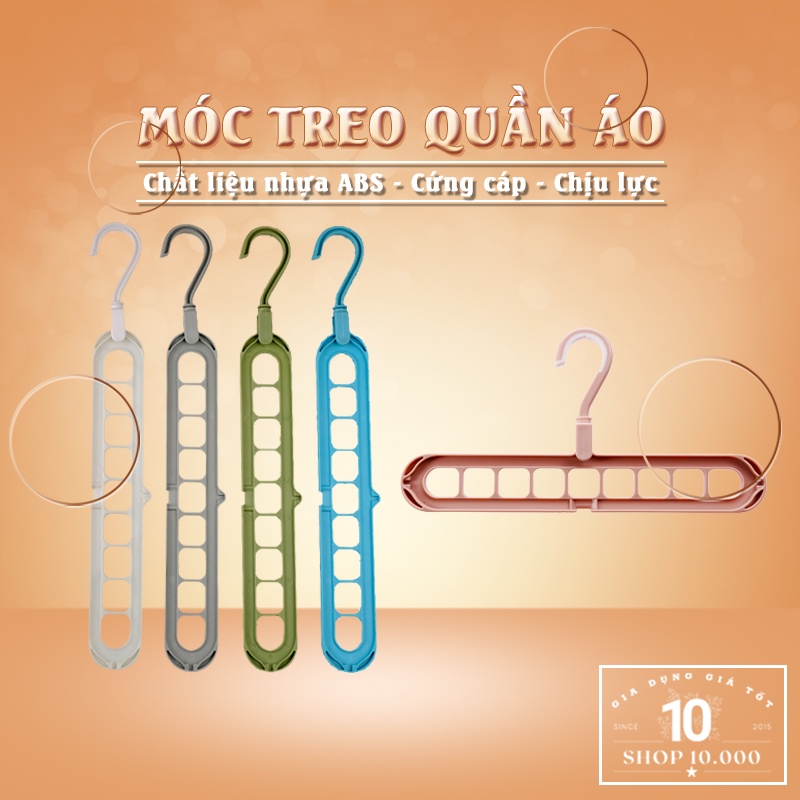 Móc treo quần áo là thiết bị sử dụng để giữ cho quần áo luôn phẳng phiu khi treo lên. Ngoài ra đây còn là vật dụng cần thiết để làm khô quần áo sau khi giặt sạch sẽ. Móc treo quần áo 9 lỗ tiết kiệm không gian được thiết kế thuận tiện cho việc treo đồ mà không bị nhăn, giữ nguyên được dáng áo quần khi cho vào tủ. Còn khi phơi ngoài trời sẽ giúp quần áo khô nhanh trong thời gian ngắn. Có thể nói móc quần áo sử dụng trong gia đình rất linh hoạt, bạn có thể phát huy được tối đa tác dụng của nó.Ngoài sử dụng trong gia đình, móc treo quần áo 9 lỗ còn có thể dùng trong khách sạn, các cửa hàng thời trang, váy cưới…