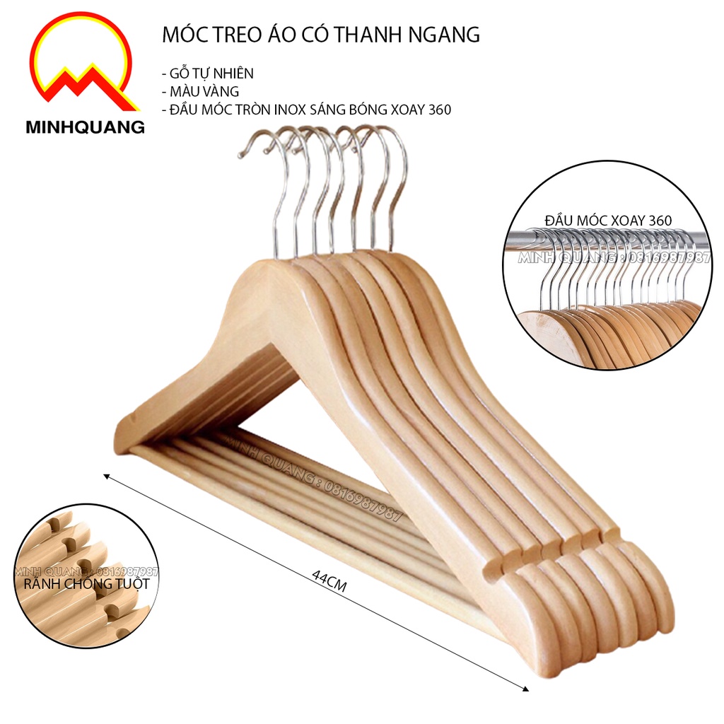 Giới thiệu móc treo quần áo bằng gỗ tam giác vàng,nâu có thanh ngang, dùng cho cửa hàng, shop thời trang và khách sạn