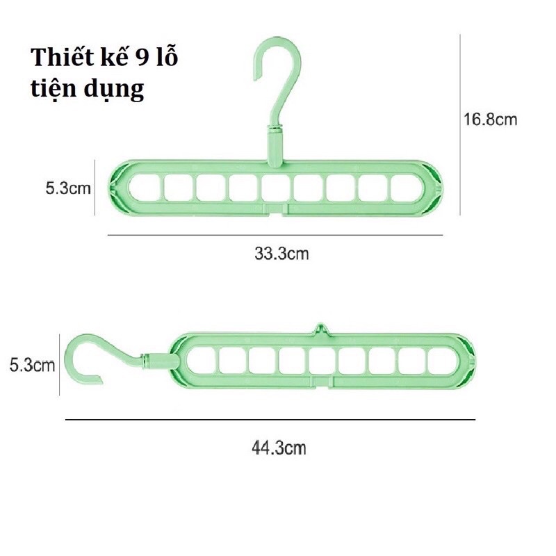 - Móc treo quần áo đa năng 9 lỗ tiện dụng giúp bạn tiết kiệm diện tích, treo thêm được nhiều quần áo.- Với thiết kế đầu xoay 360 độ giúp bạn có thể treo ngang, treo dọc tùy ý.