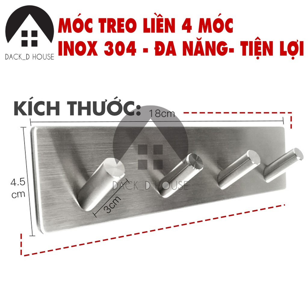 Móc treo quần áo inox Dack D Hous 4 chấu, inox 304 không rỉ sét, kèm keo 3M dán tiện lợi, gia dụng cao cấp.Chất liệu móc Dack D House; Inox 304 không rỉ sét