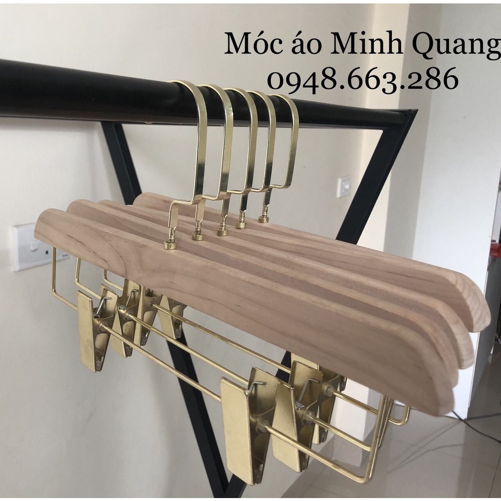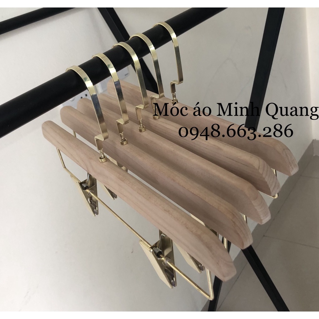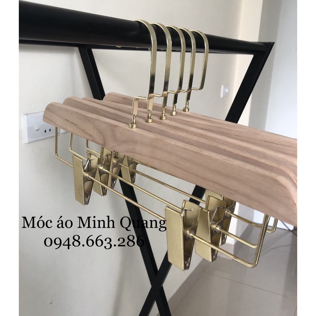 móc treo quần áo-kẹp gỗ mộc đầu kẹp mạ vàng có thanh ngang giúp tùy chỉnh độ rộng hẹp dễ dàng hơn