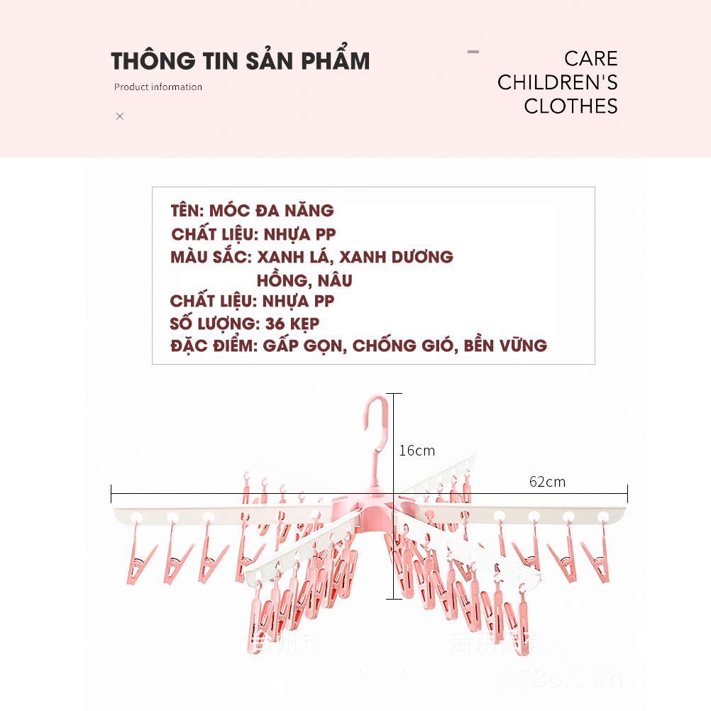 - Móc gồm 36 chiếc kẹp nhỏ giúp bạn phơi khăn tay, tất, găng tay, khăn len của bé mà không lo bị rơi dù trời gió to.