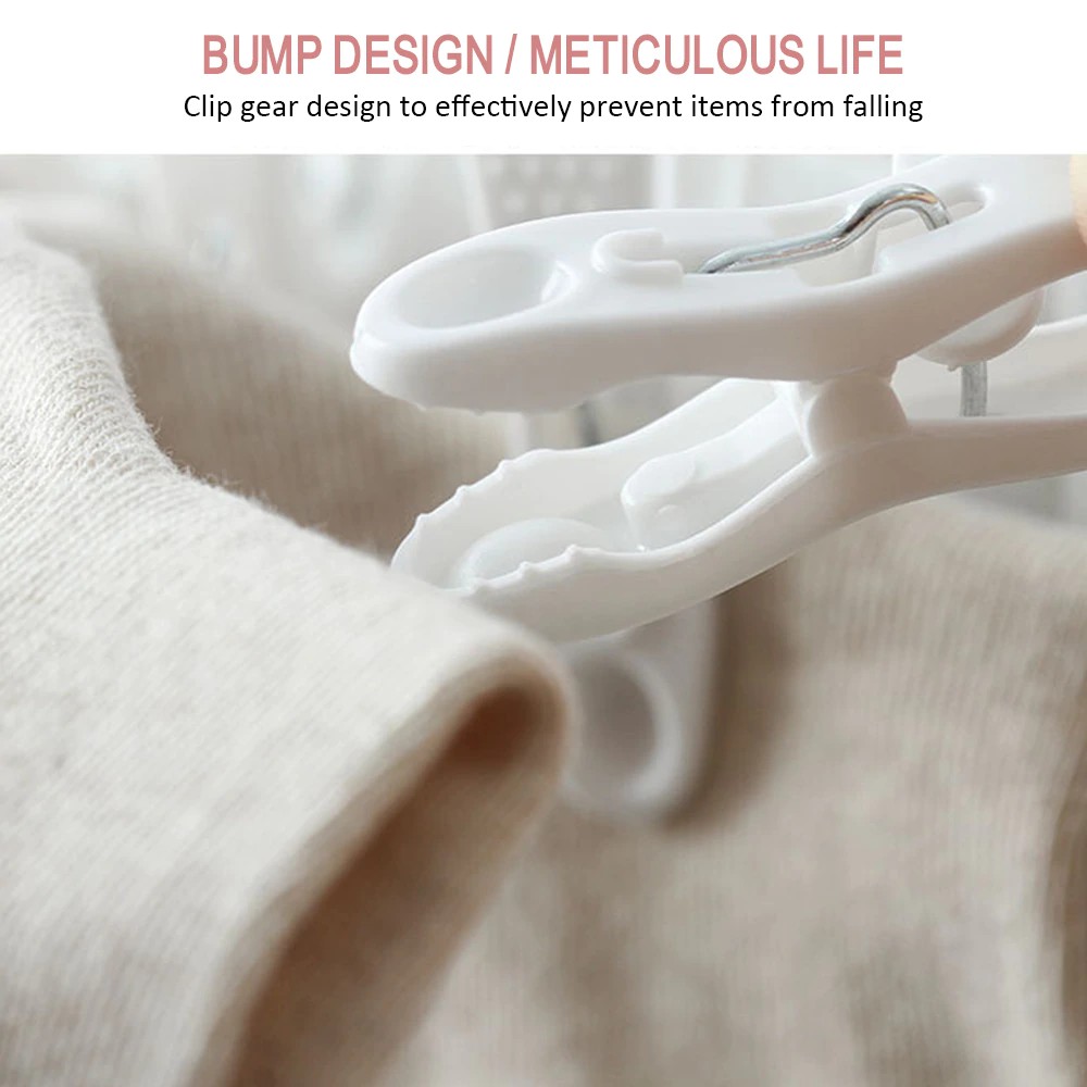 Móc gồm 10 chiếc kẹp nhỏ giúp bạn phơi khăn tay, tất, găng tay, khăn len của bé mà không lo bị rơi giù trời gió to.