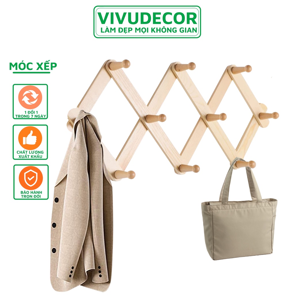 Móc treo tường Vivudecor được làm bằng 100% gỗ cao su tự nhiên sấy khô chống công vênh bằng công nghệ cao, chắc chắn chịu lực tốt. Đã qua quy trình xử lí chống mối mọt, sơn bóng không gây trầy xước và được bảo hành 1 năm.