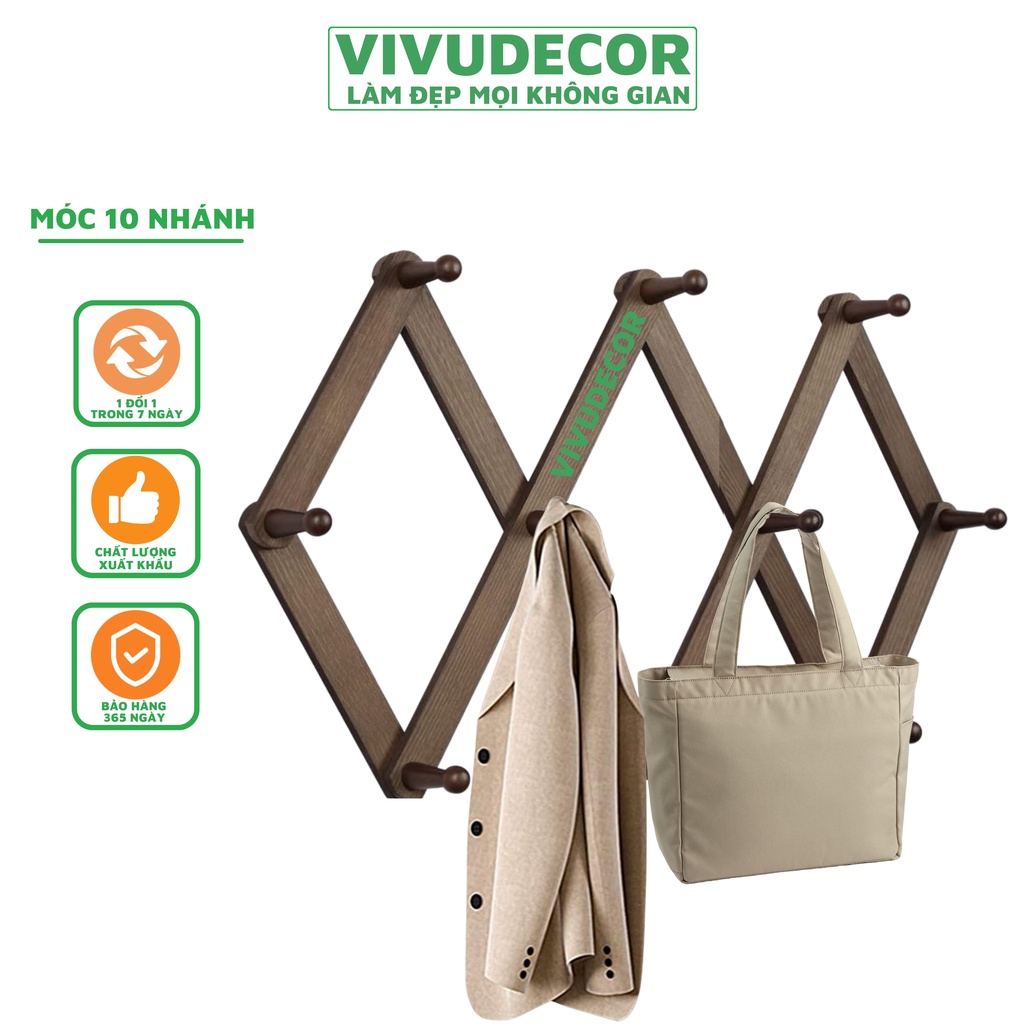 Móc treo tường Vivudecor 10 nhánh, Móc treo quần áo biến hình phù hợp với mọi không gian, tặng kèm 2 miếng dán 3M