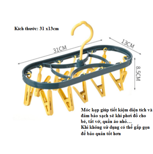 - Móc kẹp giúp tiết kiệm diện tích và đảm bảo sạch sẽ khi phơi đồ cho bé, tất vớ, quần áo nhỏ…