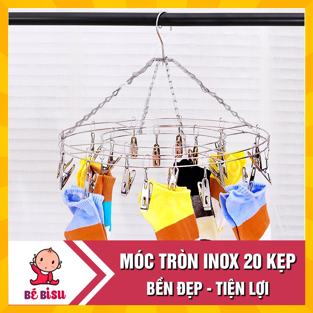 Móc treo quần áo tròn chất liệu inox, chắn chắn, tiết kiện diện tích. Mỗi móc tròn gồm 20 móc nhỏ, thuận tiện phơi khăn, tất,.... của bé.