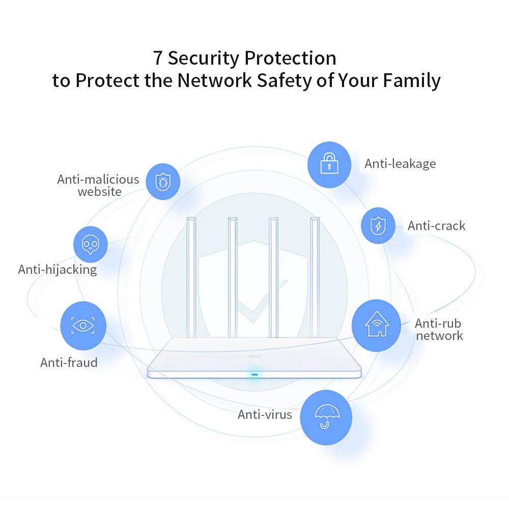 Được tích hợp 7 tính năng bảo vệ an toàn mạng giúp việc sử dụng, kết nối mạng của gia đình bạn trở nên thật đơn giản, nhẹ nhàng. các tính năng bảo vệ của bộ phát có thể kể tới như là tính năng chống rò rỉ thông tin (anti-leakage), anti-crack, anti-virus, vân vân.