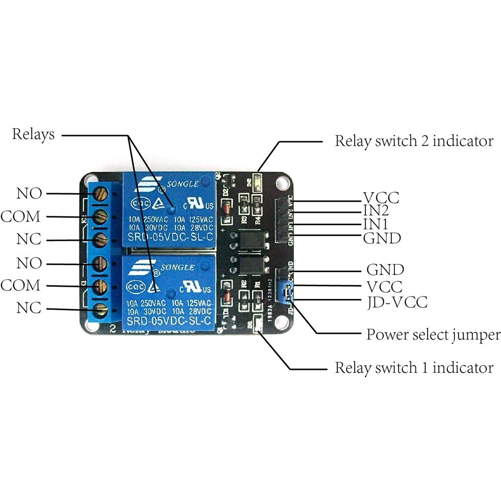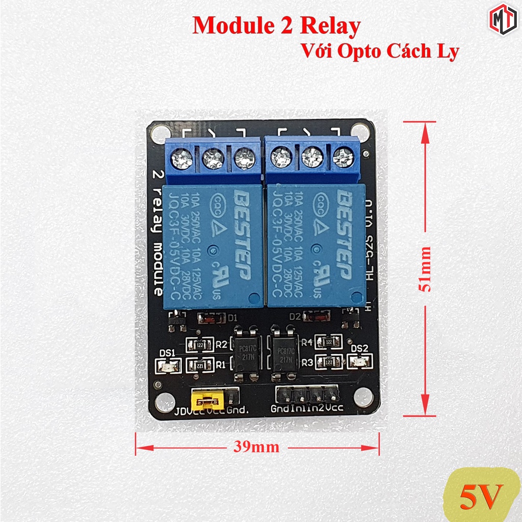 - Module 2 Relay được sử dụng để đóng ngắt, điều khiển nguồn điện công suất cao AC hoặc DC, có thể chọn đóng khi kích mức cao hoặc mức thấp bằng Jumper.