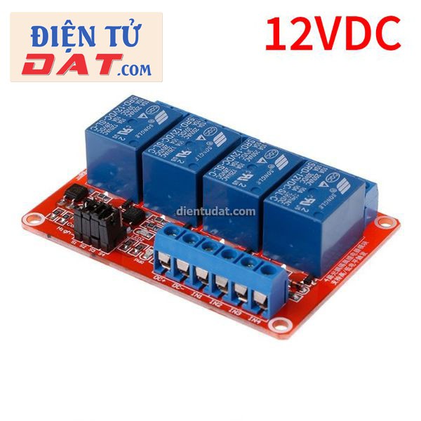 Module 4 relay 12V kích High/Low sử dụng nguồn 12VDC để nuôi mạch, tín hiệu kích có thể tùy chọn kích mức cao (High - 12VDC) hoặc mức thấp (Low - 0VDC) qua Jumper trên mỗi relay. Thích hợp cho các thiết bị sử dụng mức tín hiệu 12VDC.Thông số kỹ thuật: