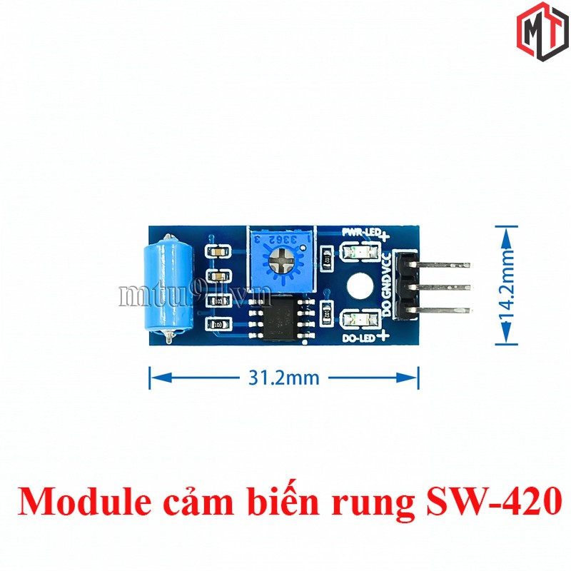Module cảm biến rung sử dụng bộ cảm biến SW-420 cùng IC LM393 nhằm phát hiện các rung động trong một ngưỡng xác định ( ngưỡng này có thể thay đổi bằng biến trở trên module).Cảm biến rung SW420 có thể phát hiện sự rung động từ mọi góc độ, và thường được sử dụng cho chống trộm, cảm ứng, rung động và đo sốc.