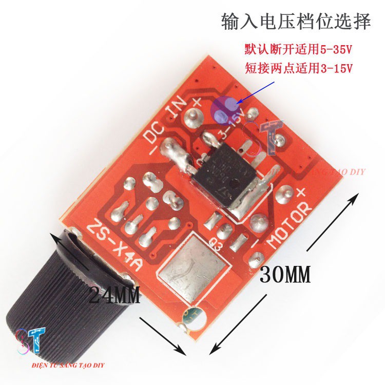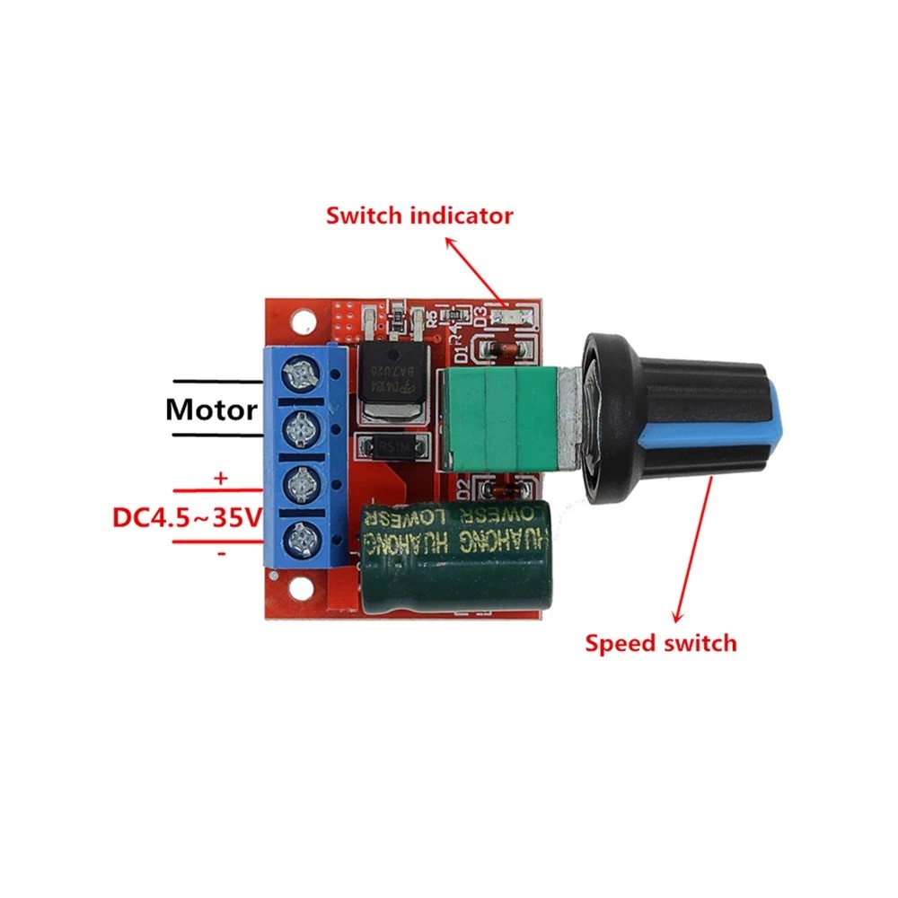 Module Điều Khiển Động Cơ PWM 5A 3-35V (Chiết Áp Công Tắc) sử dụng phương pháp hạ điện áp xuống, công xuất lên đến 5A, mạch nhỏ bàng kích thước đồng xu, điện áp vào rộng 3-35V, có cầu chì tự phục hồi sau vài giây, sản phẩm hoạt động ổn định, chi phí thấp để điều chỉnh điện áp DC, có thể làm mờ LedKhi quá công xuất cầu chì tự động ngắt và kết nối sau khi làm mát ra một vài giây, hầu như không bao giờ phải thay cầu chì