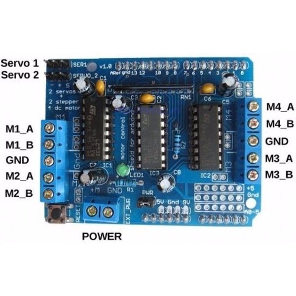 4 Động cơ DC (M1, M2, M3, M4) theo các hướng khác nhau (mỗi motor có thể quay với 1 hướng tiến/lùi bất kì tùy theo người dùng) thông qua 4 cầu H của 2 IC L293D dòng 600mA (Cực đại 1.2A).