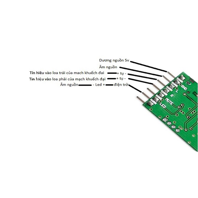 Nối 2 chân tín hiệu âm thanh loa trái phải đến đầu vào tương ứng của mạch khuếch đại qua tụ