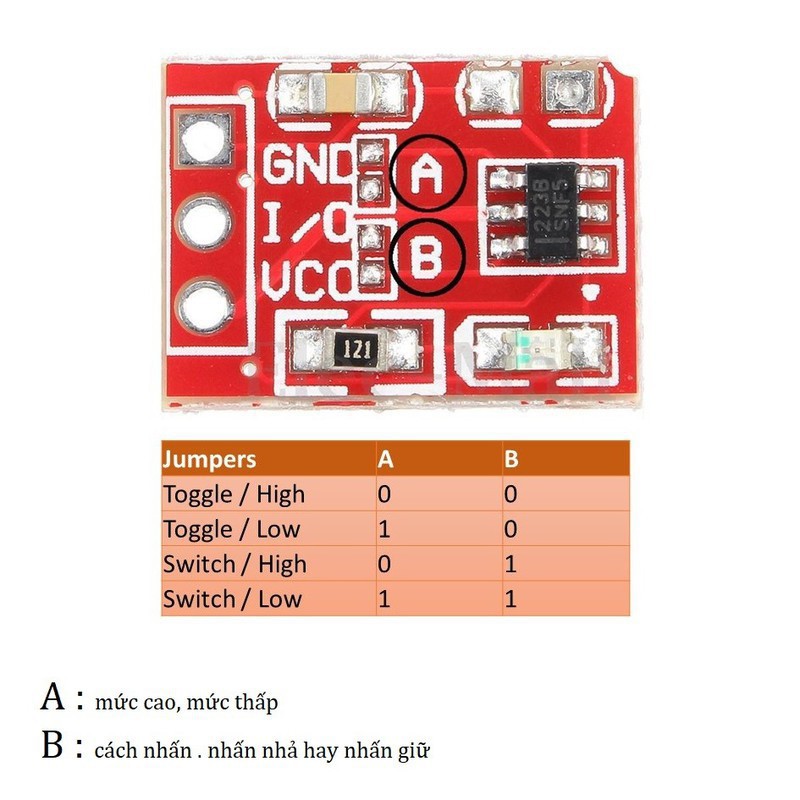 + Nhấn để chuyển tín hiệu ra từ mức thấp lên mức cao hoặc ngược lại: hàn B, hàn A hoặc không hàn A