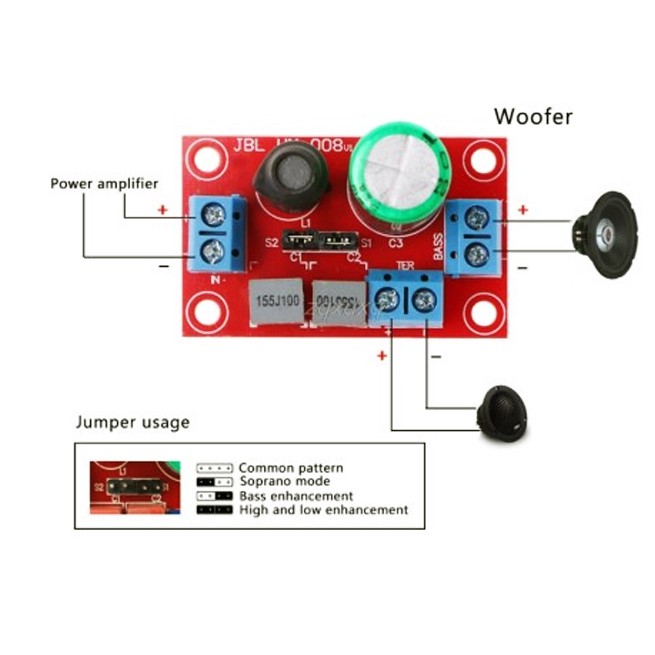 Module Phân Tần Loa Mini 2 KênhModule Phân Tần Loa Mini 2 Kênh là một mạch điện tử trong đó bao gồm các linh kiện như điện trở, tụ điện, và cuộn cảm. Phân tần có nhiệm vụ cắt tần số âm thanh cho phù hợp với từng loại loa bass, loa mid và loa treble.Module phân tần được dùng nhiều trong loa full, loa array, loa sub, loa 2 đường tiếng,.... Phân tần loa có nhiệm vụ rất quan trọng chúng không chỉ có nhiệm vụ chính là cắt tần số âm thanh cho loa mà phân tần còn có nhiệm vụ bảo vệ loa. Phân tần là mạch điện từ RLC bao gồm các linh kiện điện trở, cuộn cảm và tụ điện. Mỗi linh kiện trong mạch điều có một nhiệm vụ nhất định trong việc cắt tần số âm thanh.