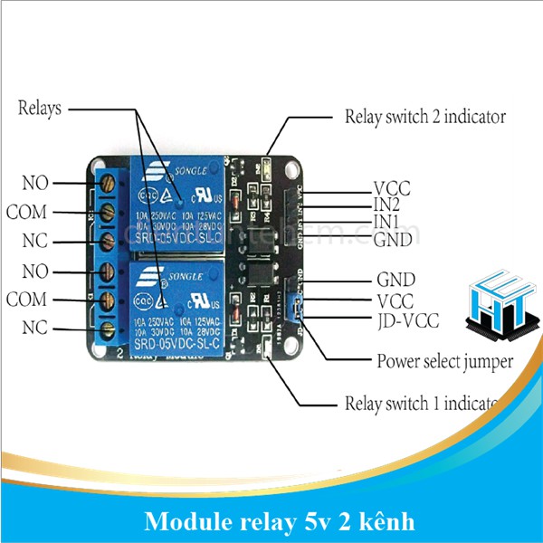 IN1 và IN2 dùng để điều khiển relay 1 và relay 2, tích cực mức thấp