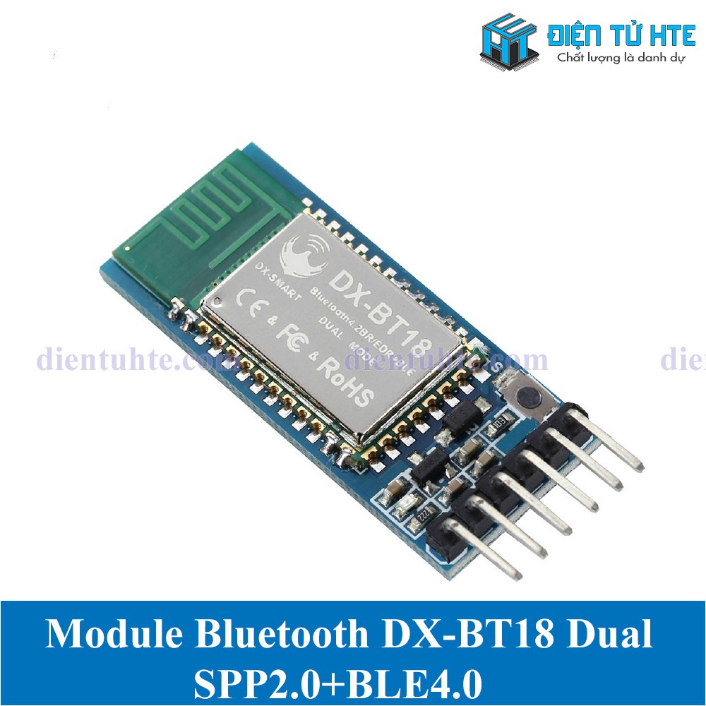 Module thu phát Bluetooth DX-BT18 dual mode SPP2.0+BLE4.0 tương thích với HC-05 và HC-06DX-BT18 là một mạch Bluetooth 4.0 tương thích với HC-05, HC-06 với Bluetooth chế độ kép (Dual-Mode) áp dụng cho đường truyền dữ liệu không dây, sử dụng chip Bluetooth + thiết kế ăng ten trên PCB, chip SOC nhúng với giao thức BT4.2 Dual-Mode.
