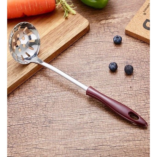 Giới thiệu Môi canh có lỗ (Vá môi), muỗng múc canh bằng kim loại, môi múc cơm bằng gỗ dài 22cm, rộng 6cm