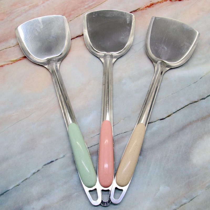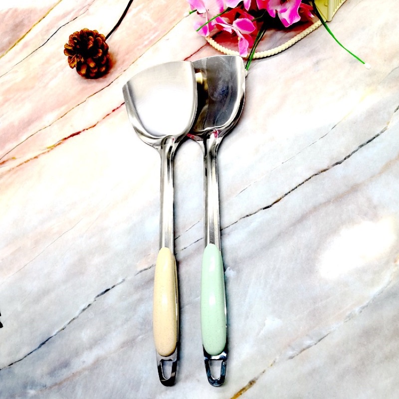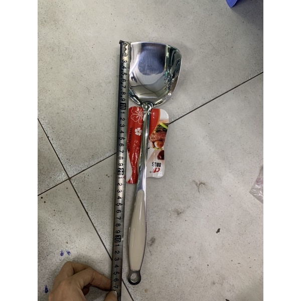xẻng inox dày dặn có bọc nhựa chống nóng.dùng để xào đồ ăn. lật đồ ăn khi rán