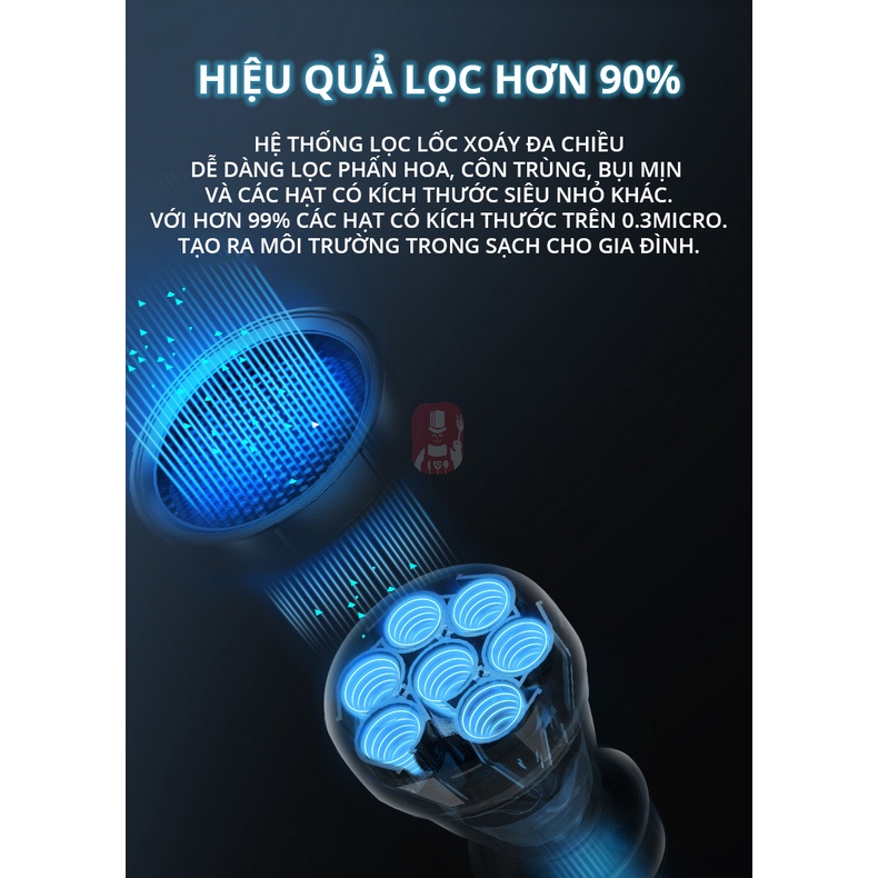 3. Hiệu quả lọc hơn 90% nhờ hệ thống lọc lốc xoáy đa chiều, dễ dàng lọc phấn hoa, côn trùng, bụi mịn, và các hạt có kích thước siêu nhỏ khác tạo ra môi trường trong sạch cho gia đình.