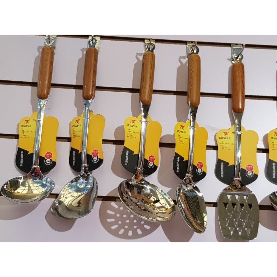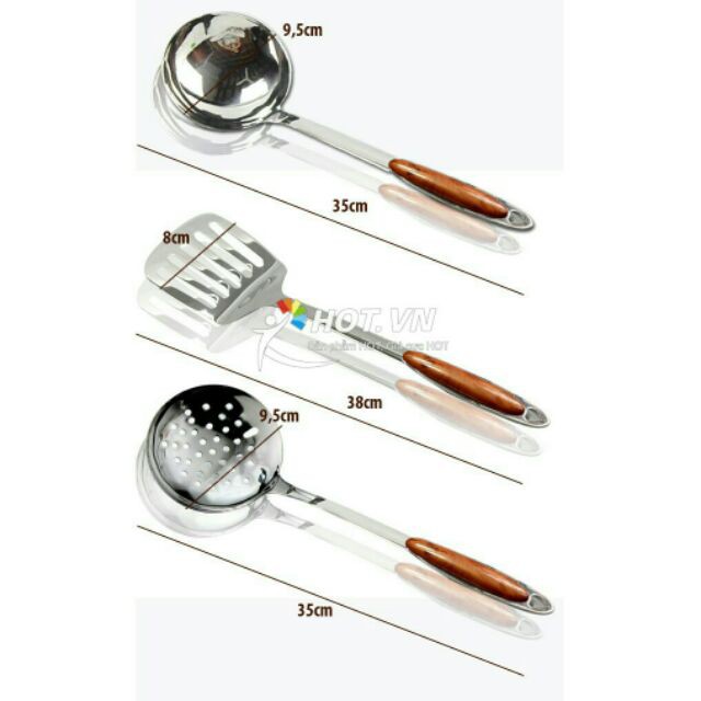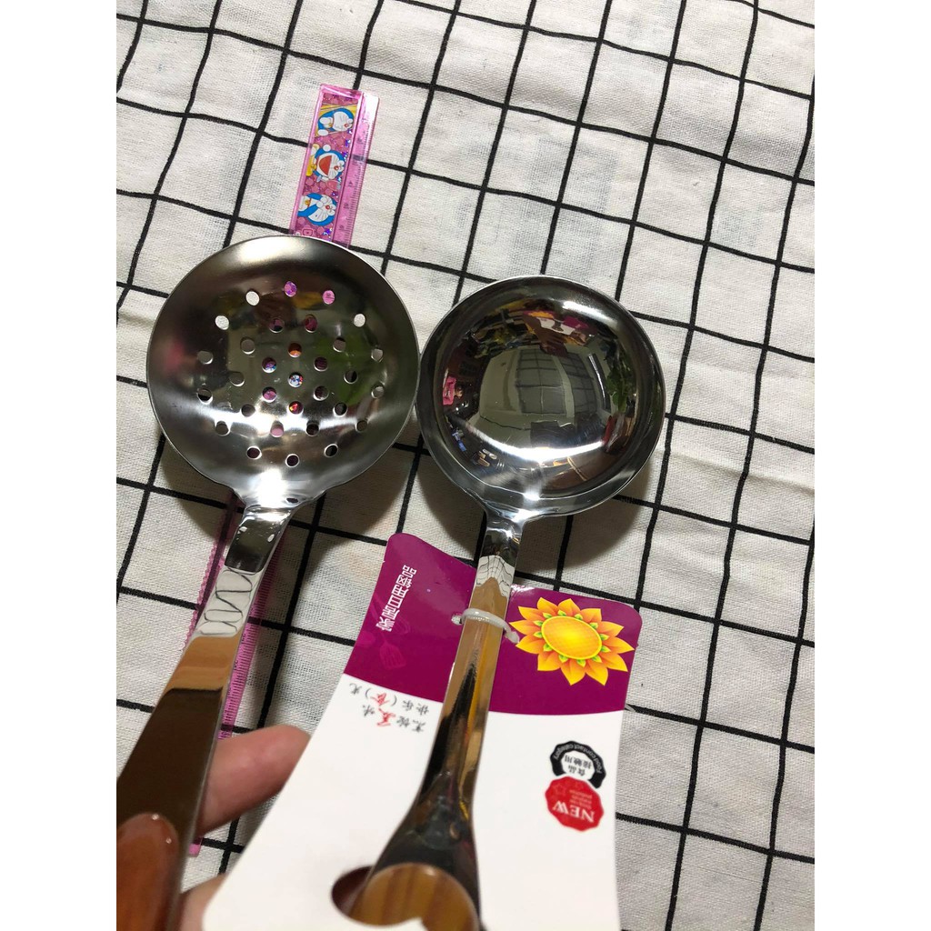 Nhà cửa & Đời sống > Dụng cụ nhà bếp > Cây vét bột & đồ gắp thức ăn || Môi thủng ăn lẩu, vớt đồ Inox cán vân gỗ KT: 35x9,5 cmCòn hàng